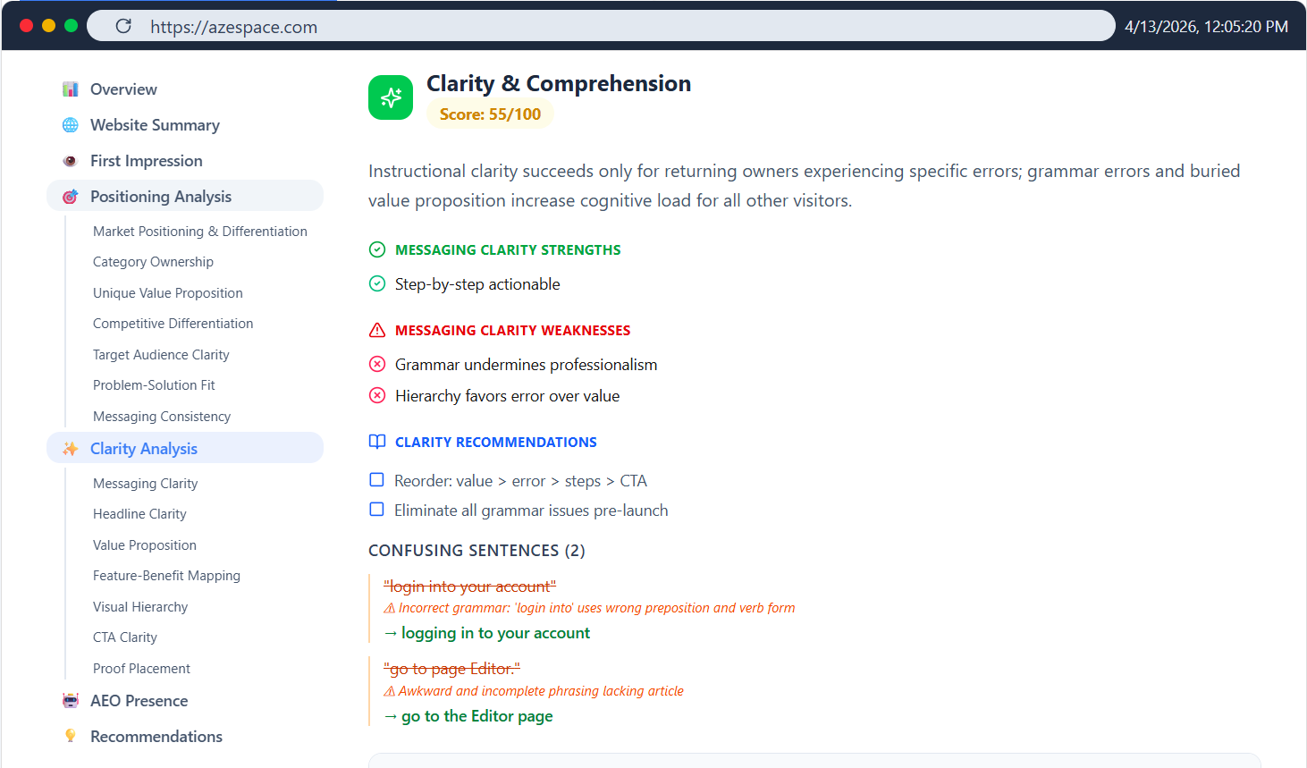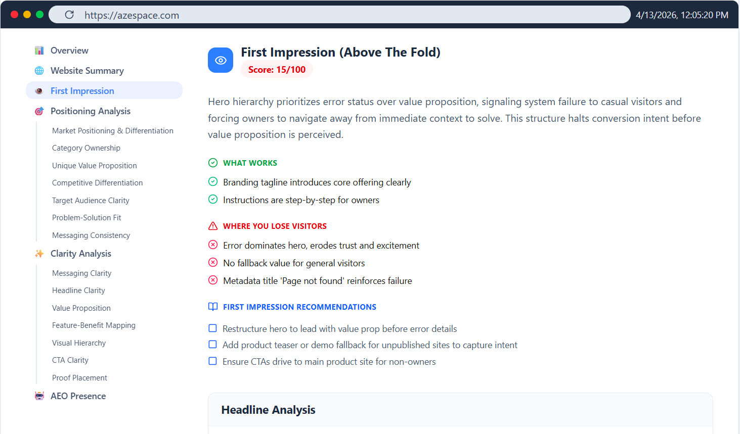 Our engine analyzes your startup against 10,000+ SaaS sites to spot: commodity positioning, confusing messaging, and AI invisibility killing discovery. You get cold, clinical data—no opinions, no fluff.